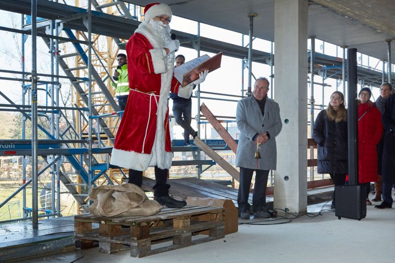 Mit dabei war auch der Nikolaus, der in Versform allen Beteiligten für den reibungslosen Projektverlauf dankte: den Architekten, Planern und Technikern, den Firmen vom Bau sowie dem Liegenschaftsamt der Stadt Köln und den Vertretern der Musikschule Köln, die das Gebäude ab Sommer 2022 als Interimsschule nutzen wird. Musikalisch begleitet wurde die Feierstunde von dem jungen Saxophonisten-Quartett Eternum.
