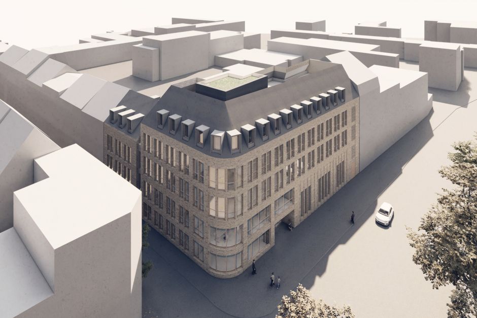 Kaspar Kraemer Architekten, Köln haben den Neubau als eine tektonisch gegliederte Blockrandbebauung konzipiert, der den grünen Innenhof mit seinen Bestandsbäumen abschließt. Die Formensprache ist von den klassischen Vorbildern der städtischen Geschäfts- und Wohnhäusern der Umgebung beeinflusst. Der Neubau, der in Stahlbeton errichtet wurde, ist mit einer hellen Klinkerfassade gestaltet.