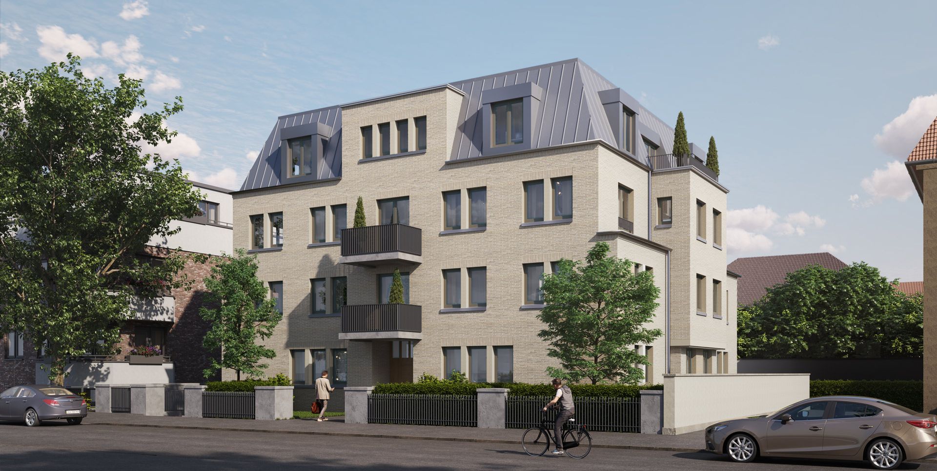Inspiriert von Bauformen traditioneller urbaner Architektur entsteht nach den Plänen von Axel Steudel Architekten, Köln ein ausgewogen gestalteter Stadtbaustein. Hinter der klar strukturierten Fassade aus hellem Klinker befinden sich barrierefrei geschnittene Wohnungen mit großzügigen Balkonen sowie eine Penthouse-Wohnung im mit Metall gedeckten Mansarddach. Während hier drei Dachterrassen in unterschiedlicher Himmelsrichtung die Wohnbereiche ins Freie erweitern, verfügen die Wohnungen in der Hochparterre über eigene Gärten.