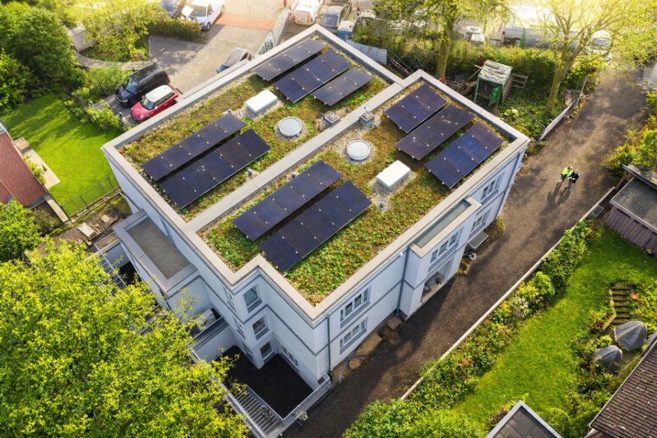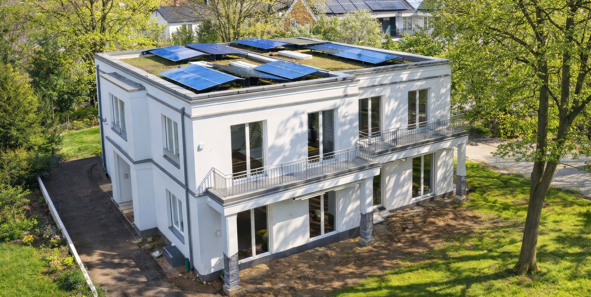 Großen Wert hat der Bauherr auf die Nachhaltigkeit des Projektes gelegt. Zwei unabhängige PV-Anlagen und Wärmepumpen stellen die energetische Versorgung sicher. Auch die Dämmung, der Sonnenschutz und das Regenwassermanagement sind entsprechend hochklassig.