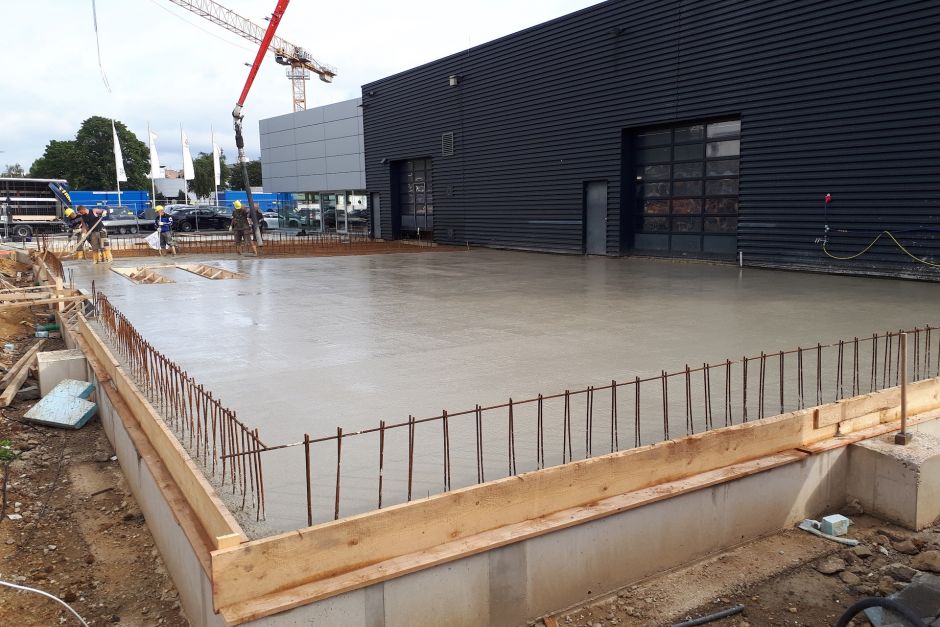 Die Erweiterung erfolgte bei laufendem Betrieb. Sowohl die bestehende Ausstellungsfläche als auch die Werkstatt mussten hierbei großflächig geöffnet und an den Neubau angeschlossen werden, ohne dass es zu einer grundsätzlichen Störung der Betriebsabläufe kommen dürfte. Bei diesem Projekt war Friedrich Wassermann als Generalunternehmer zuständig für Rohbau, Dach, Fassade und Ausbau.