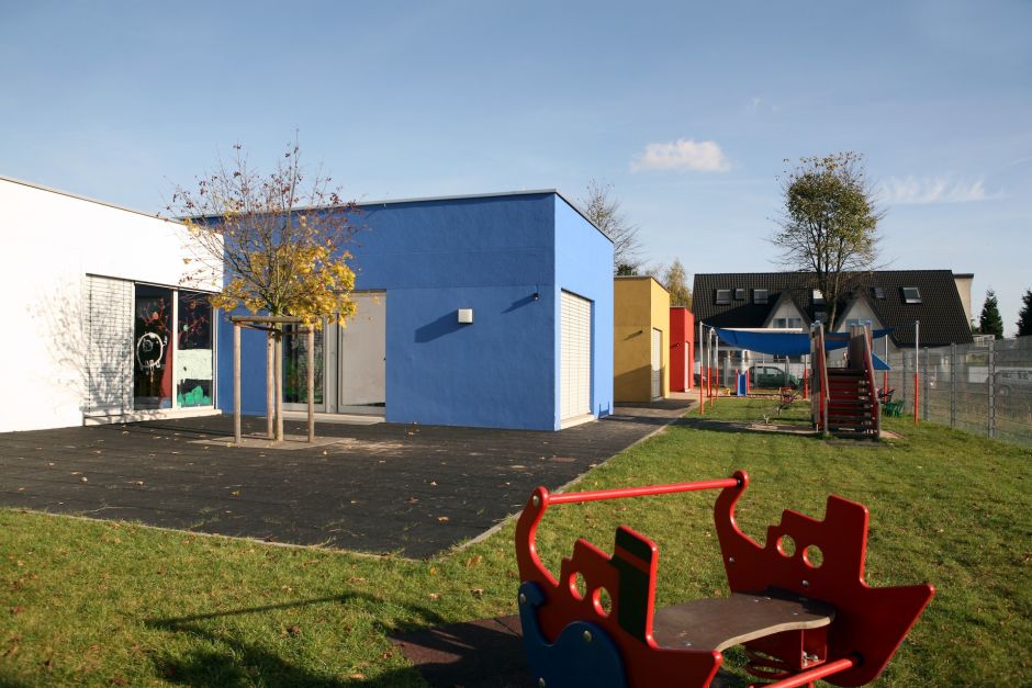 Durch den Grundriss in Form eines „E“ entstehen zwei geschützte Spielhöfe, in deren Mitte ein Baum Schatten spendet. Hierhin können sich die Kinder zurückziehen, wenn sie nicht auf dem Rasen oder den Spielgeräten herumtollen wollen. Durch unsere kompetente Beratung ermöglichten wir eine praktische Einrichtung der Tagesstätte für einen reibungslosen Betrieb.
